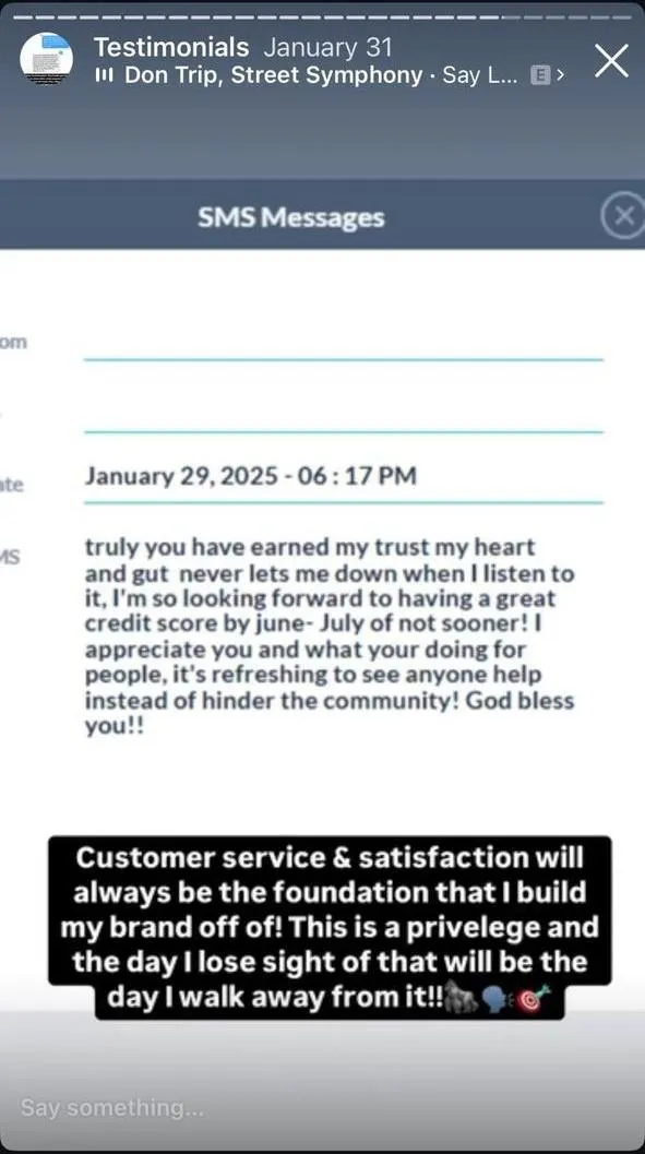 "Truly you have earned my trust, my heart and gut never lets me down when I listen to it. I'm so looking forward to having a great credit score by June–July if not sooner! I appreciate you and what you're doing for people. It's refreshing to see anyone help instead of hinder the community! God bless you!!"