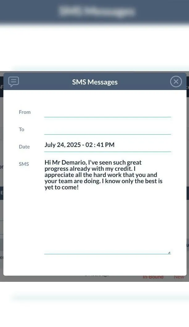 "Hi Mr. Demario, I've seen such great progress already with my credit. I appreciate all the hard work that you and your team are doing. I know only the best is yet to come!"